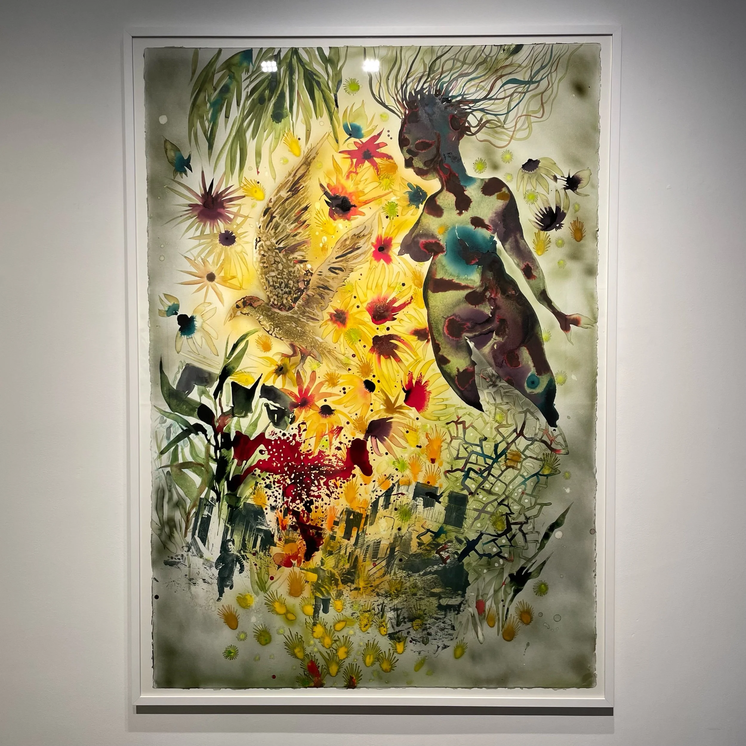 It’s not entirely clear if the floating female figures have had their limbs severed or amputated, and its a bit unnerving to dwell on. A closer look at the flowery motifs reveals bullet holes or the impact of shrapnel. And there is so much red blood splashed across these works that it’ll remind you of a gruesome medical scene in the aftermath of an explosion. Which, by the way, you will see in a variety of black & white news imagery that has been screen printed onto the base layer of the work. It’s heartwarming to see children smiling and playing in the streets, but a careful look reveals war torn wreckage. Maybe they aren’t playing in the streets, but attempting to run towards safety?
