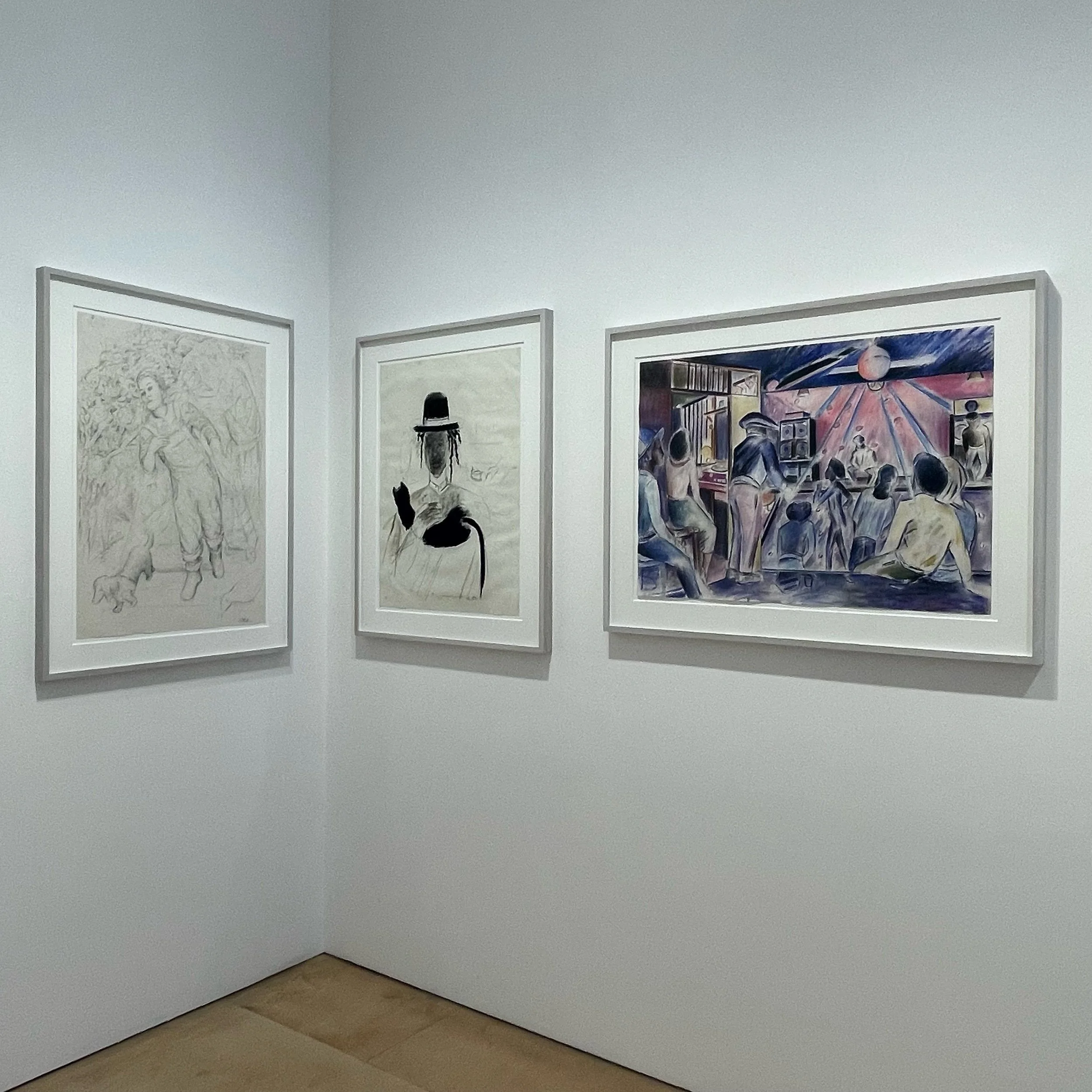 Denzil Forrester is a new name to me, and I greatly enjoyed the opportunity to compare his recent large paintings with a selection of archival drawings mostly made in the 80s. The artist often reflects on Black British culture and it’s clear that Forrester considers music to be an integral aspect of that. His work depicting musicians and nightclubs is filled with so much motion and joy, they made me want to sing and dance along with them. But I spent most of my time standing perfectly still, transfixed by the palm frond patterns and unusual perspectives in one of the largest works, ‘In Homenow’ (2022-2023).
