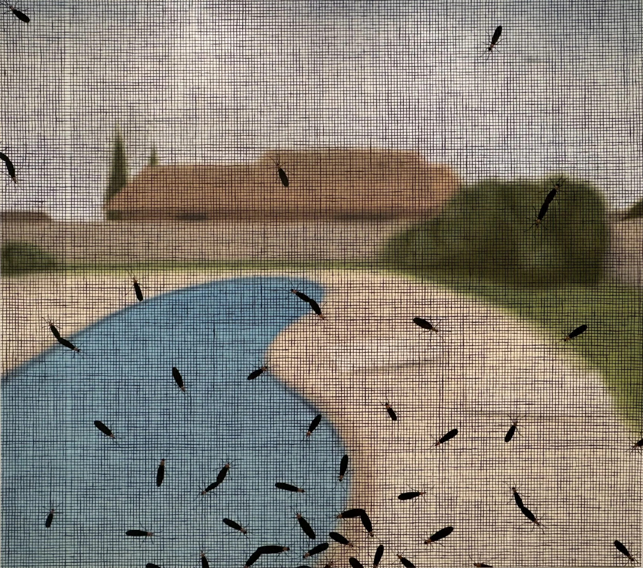 Menace is a powerful word and I’m not convinced Bils’ intended this painting to trigger the same kind of unease viewers get when watching a slasher film. It’s more likely that Florida native Bils has the same kinds of memories I do of swatting away or squishing those bugs, or watching the windshield wipers methodically fail to remove as many splattered pairs as possible before you have to grumble your way out of the car to scrape them off the glass by hand.